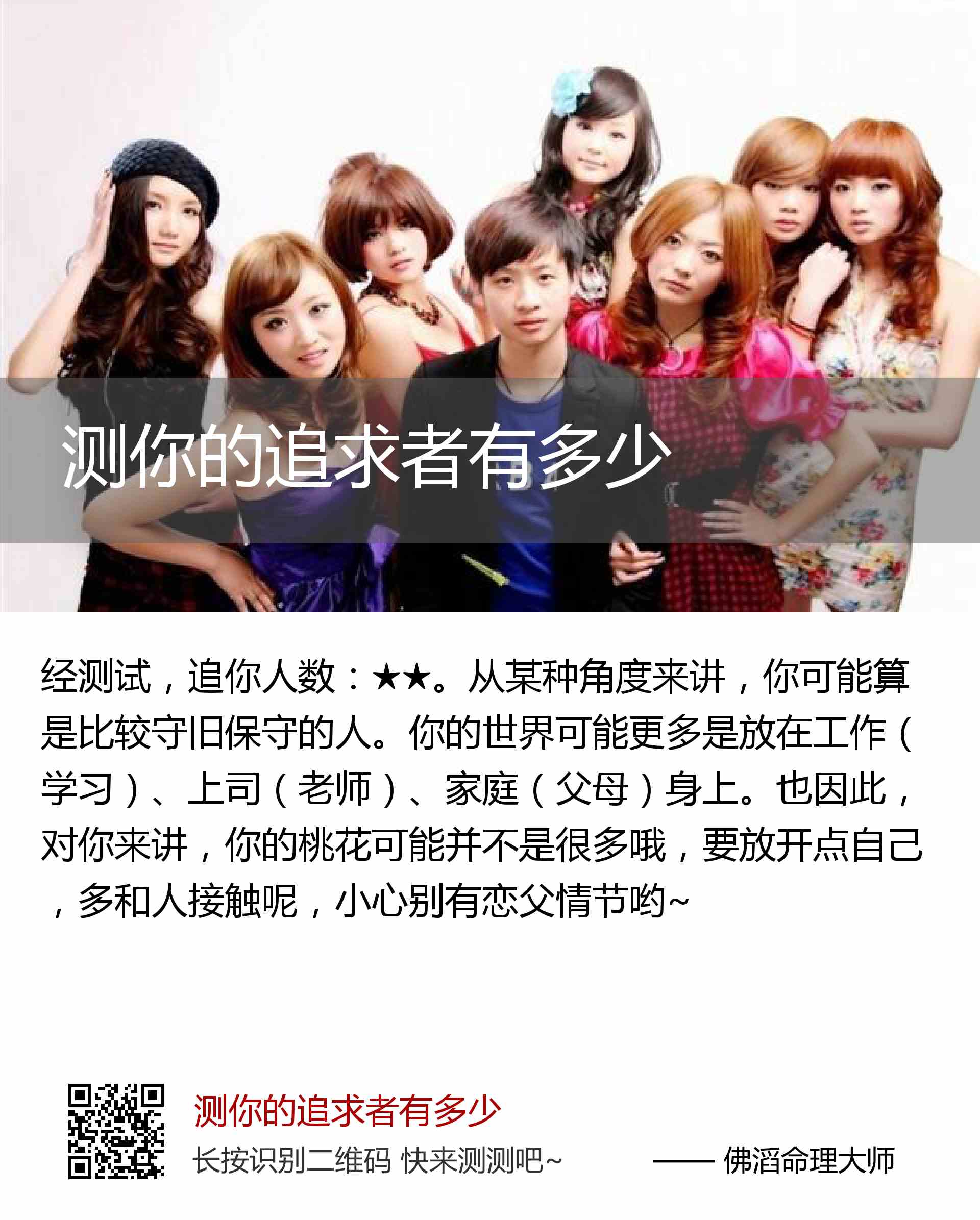 从某种角度来讲,你可能算是比较守旧保守的人。你的世界可能更多是放在工作(学习)、上司(老师)、家庭(父母)身上。也因此,对你来讲,你的桃花可能并不是很多哦,要放开点自己,多和人接触呢,小心别有恋父情节哟~