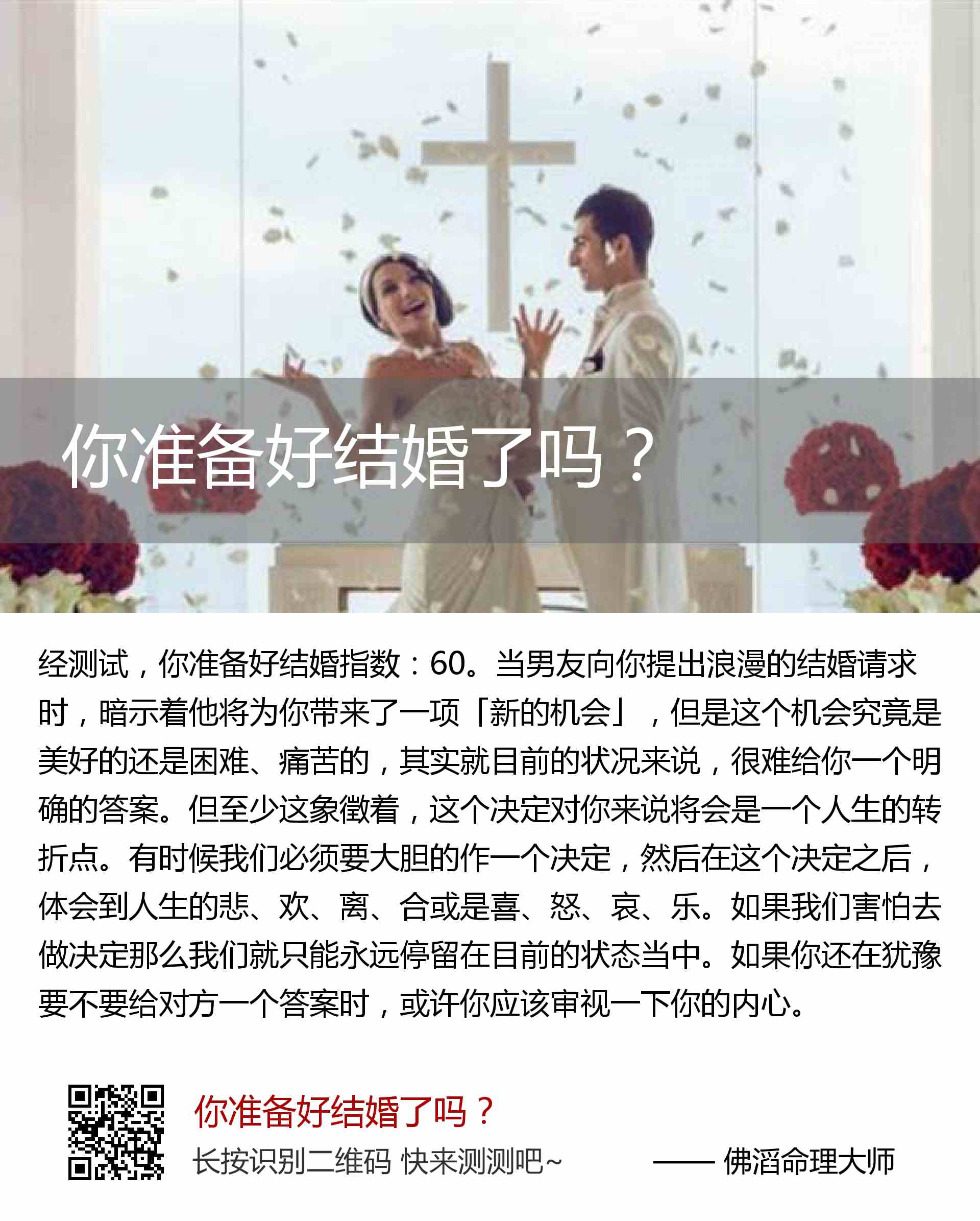 当男友向你提出浪漫的结婚请求时,暗示着他将为你带来了一项「新的机会」,但是这个机会究竟是美好的还是困难、痛苦的,其实就目前的状况来说,很难给你一个明确的答案。但至少这象徵着,这个决定对你来说将会是一个人生的转折点。有时候我们必须要大胆的作一个决定,然后在这个决定之后,体会到人生的悲、欢、离、合或是喜、怒、哀、乐。如果我们害怕去做决定那么我们就只能永远停留在目前的状态当中。如果你还在犹豫要不要给对方一个答案时,或许你应该审视一下你的内心。