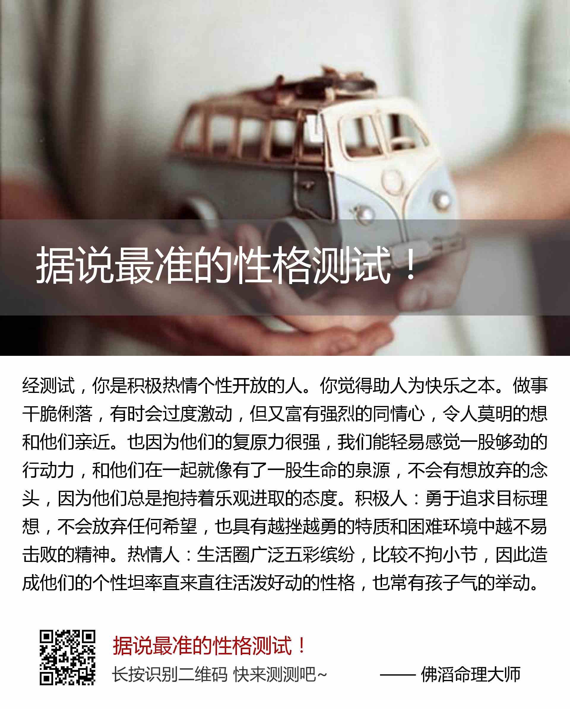 你觉得助人为快乐之本。做事干脆俐落,有时会过度激动,但又富有强烈的同情心,令人莫明的想和他们亲近。也因为他们的复原力很强,我们能轻易感觉一股够劲的行动力,和他们在一起就像有了一股生命的泉源,不会有想放弃的念头,因为他们总是抱持着乐观进取的态度。积极人:勇于追求目标理想,不会放弃任何希望,也具有越挫越勇的特质和困难环境中越不易击败的精神。热情人:生活圈广泛五彩缤纷,比较不拘小节,因此造成他们的个性坦率直来直往活泼好动的性格,也常有孩子气的举动。