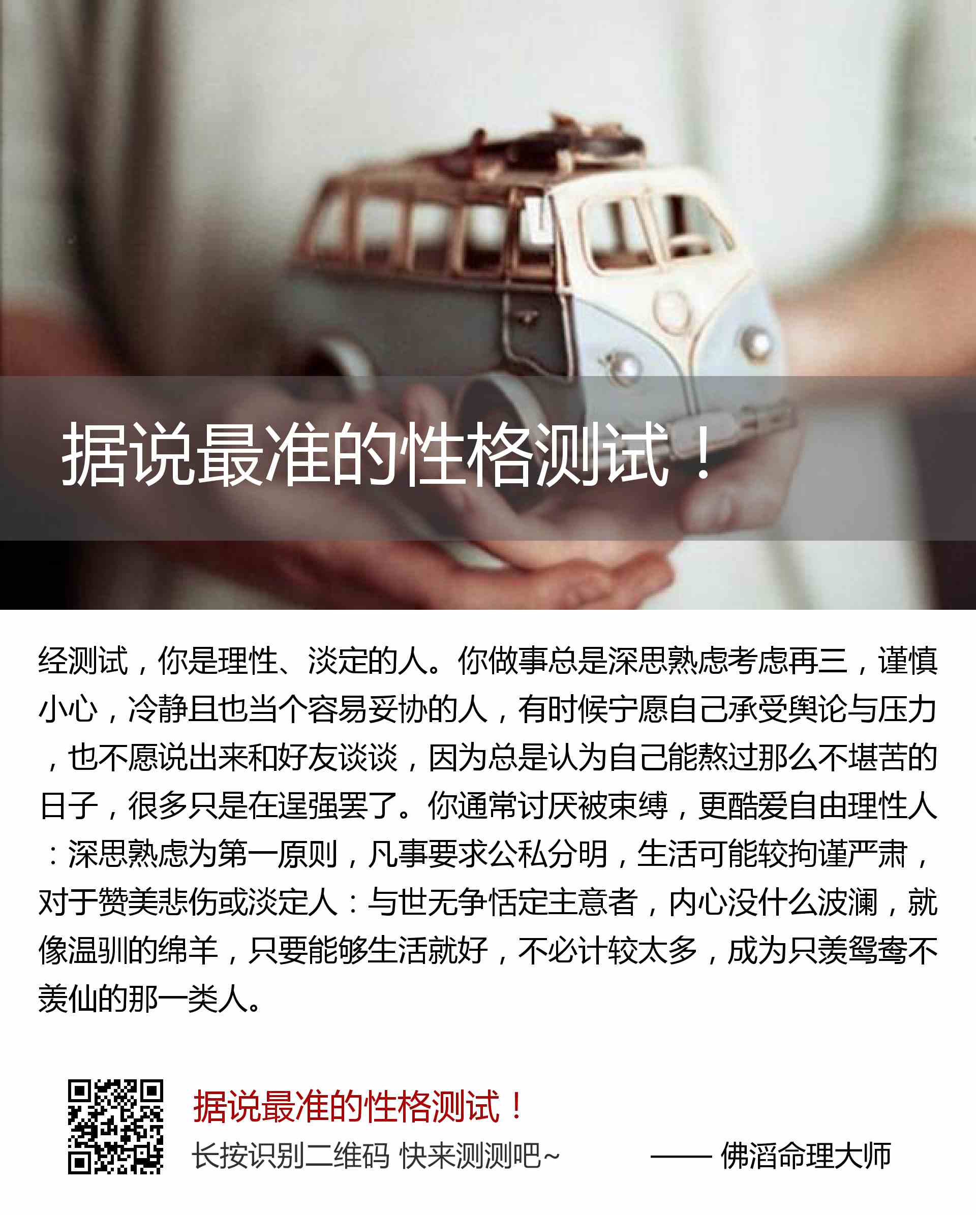你做事总是深思熟虑考虑再三,谨慎小心,冷静且也当个容易妥协的人,有时候宁愿自己承受舆论与压力,也不愿说出来和好友谈谈,因为总是认为自己能熬过那么不堪苦的日子,很多只是在逞强罢了。你通常讨厌被束缚,更酷爱自由理性人:深思熟虑为第一原则,凡事要求公私分明,生活可能较拘谨严肃,对于赞美悲伤或淡定人:与世无争恬定主意者,内心没什么波澜,就像温驯的绵羊,只要能够生活就好,不必计较太多,成为只羡鸳鸯不羡仙的那一类人。
