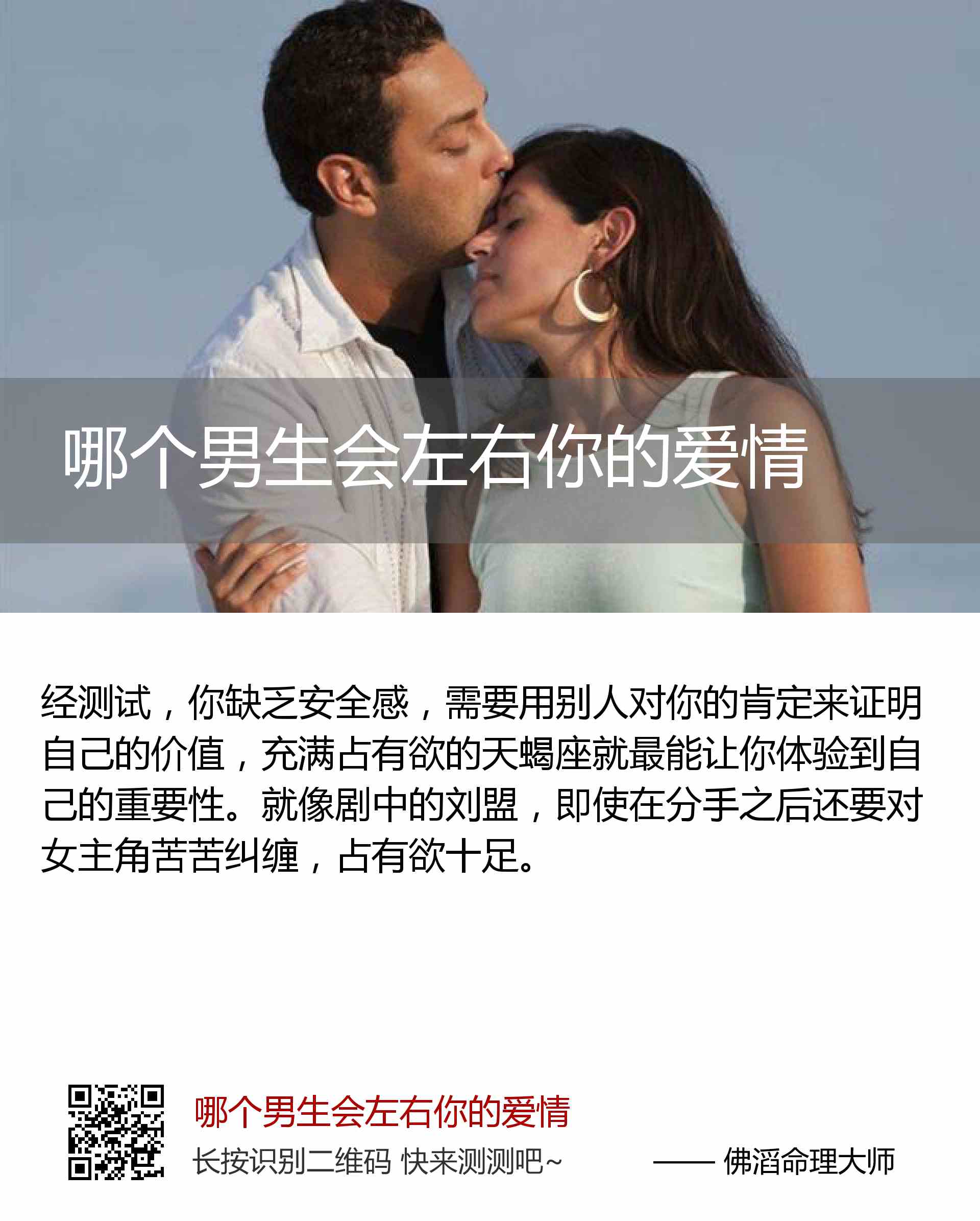 你缺乏安全感,需要用别人对你的肯定来证明自己的价值,充满占有欲的天蝎座就最能让你体验到自己的重要性。
